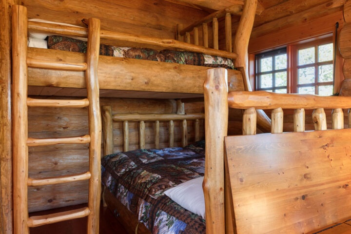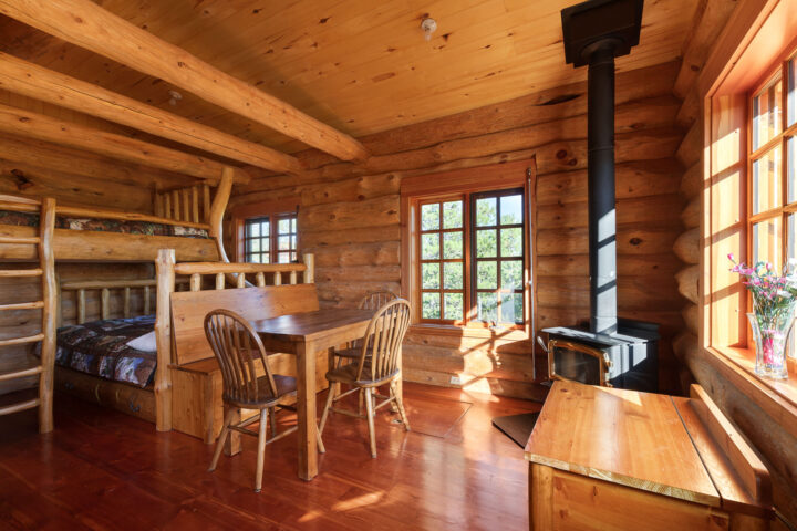 The West by North cabin is very similar to its neighbour, East by North, with a slightly different log bed configuration. Both cabins have a spacious front porch where many a good cup of coffee has been enjoyed watching an early morning sunrise.